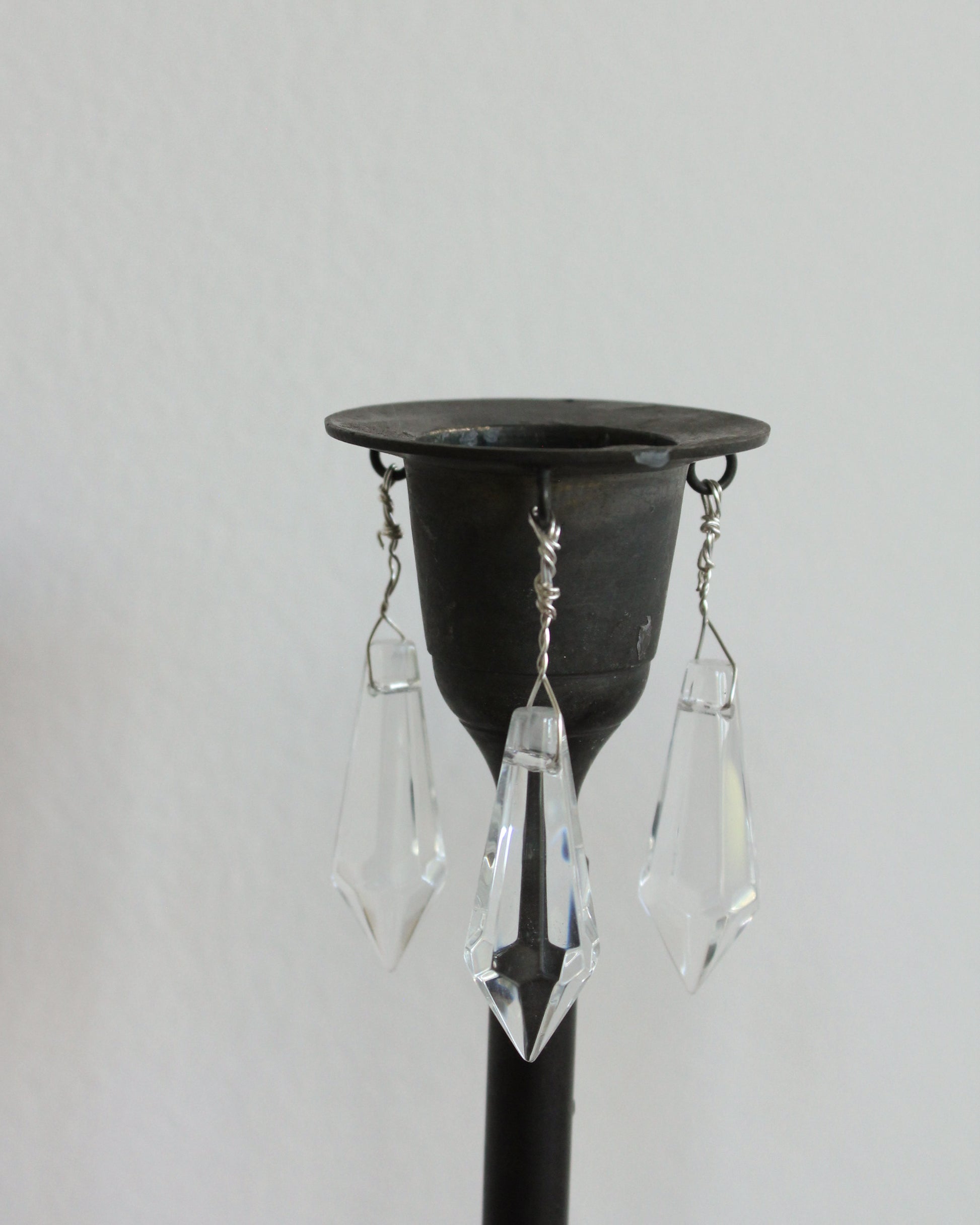 A pair of elegant candle holders with 3 clear cut crystals around each candle cup. Silver plated brass, each with a square base with a green felt pad. Heavy patina.