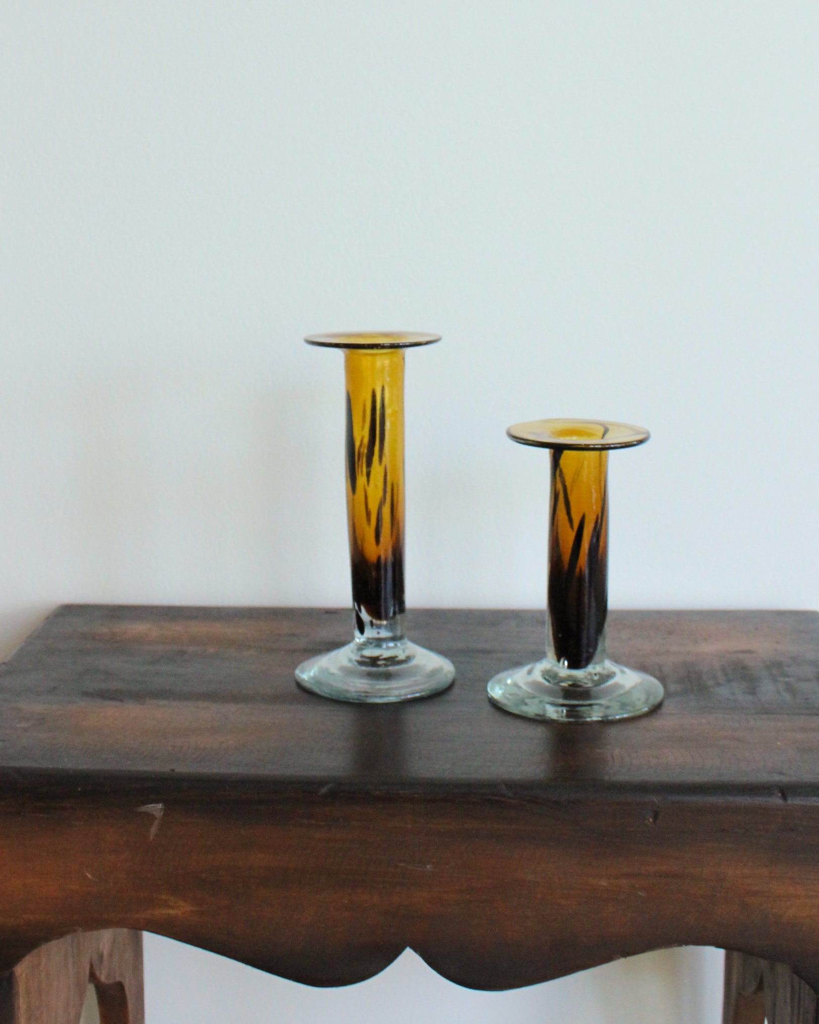 Handblown pair of candlesticks with a tortoise shell-esque design. Clear bases. No chips or cracks.