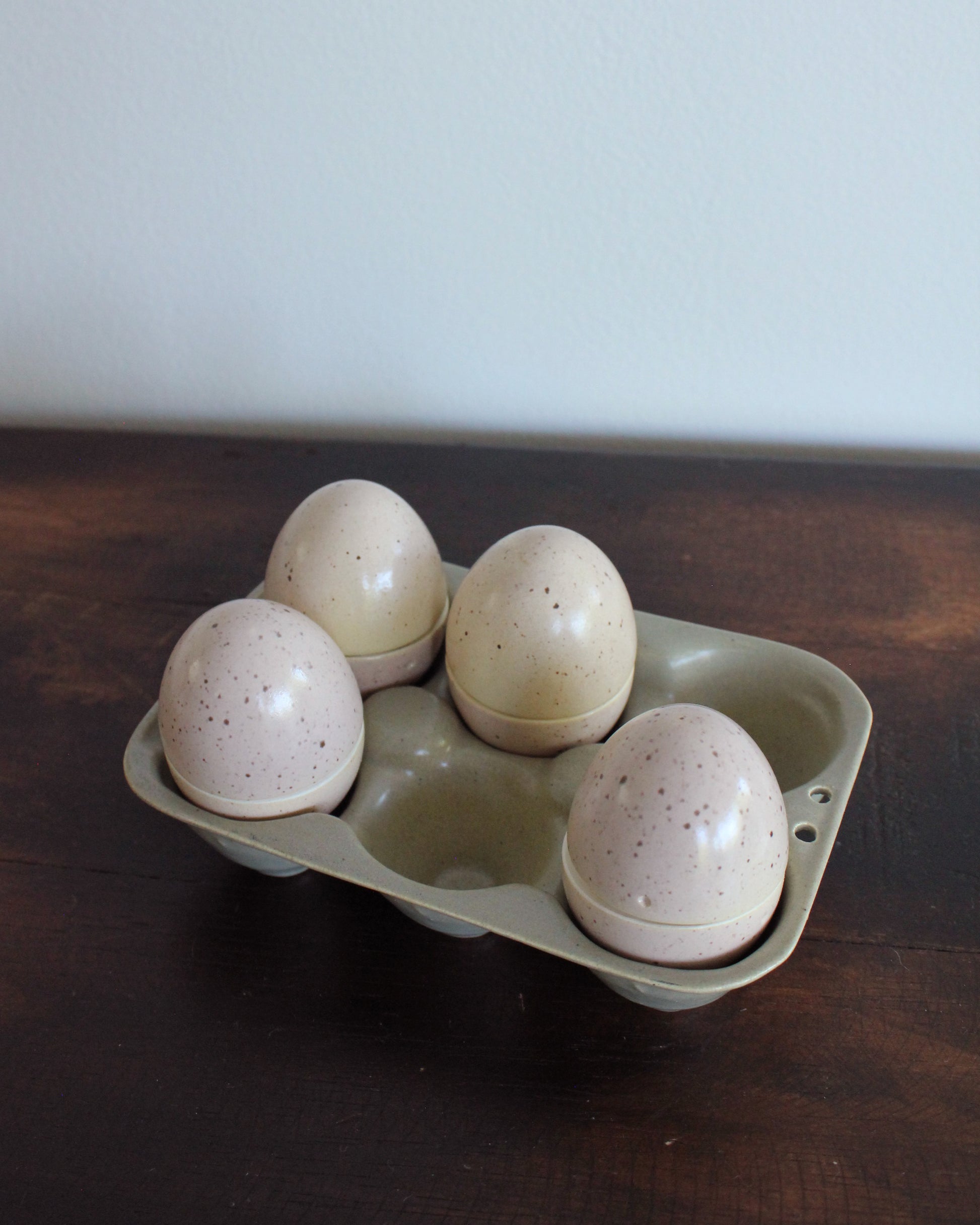 Both a sculptural piece and a catchall. Ceramic mottled green egg carton with wonderful details, and 4 speckled ceramic eggs that open and can be used as little boxes. Egg tops do not fit perfectly due to their handmade nature.