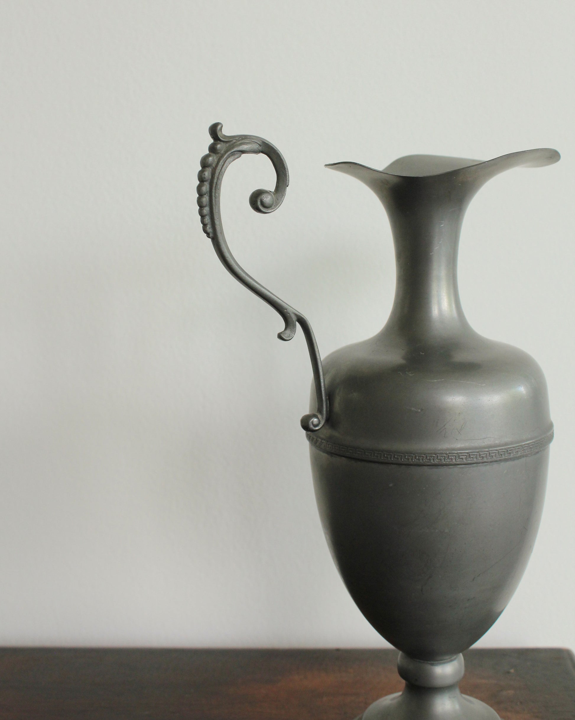 Italian 20th Century pewter pitcher, featuring a Greco-Roman style pattern to a band around the body and base of the vessel. Single arm that may have at one time been connected to the body. Light signs of age, small dent on one side. Suitable for florals.