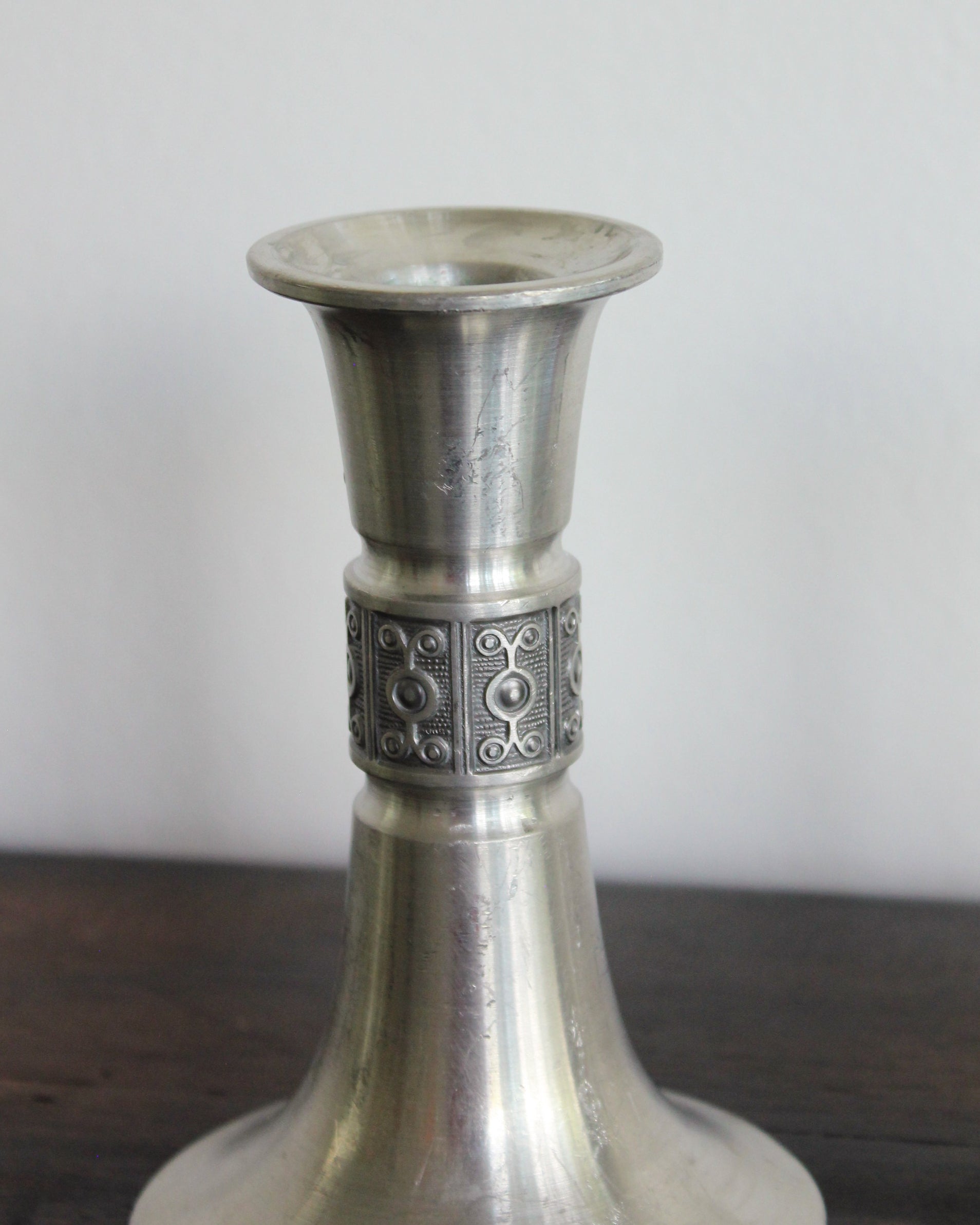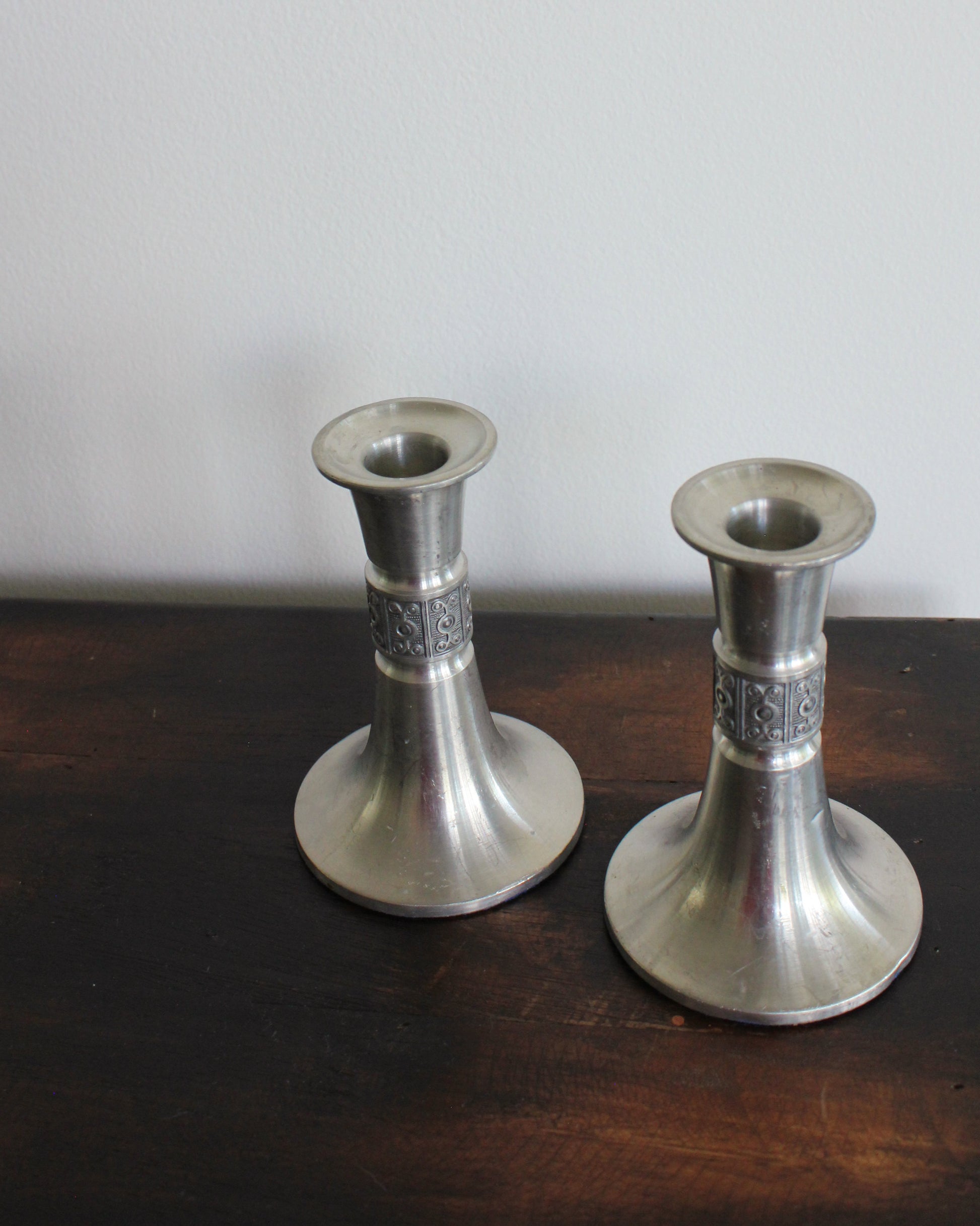 A pair of 1960s pewter candlesticks crafted by the renowned Norwegian pewter smiths, Haugrud. Each is engraved with a scrolling Viking rune design featuring intricate shields.