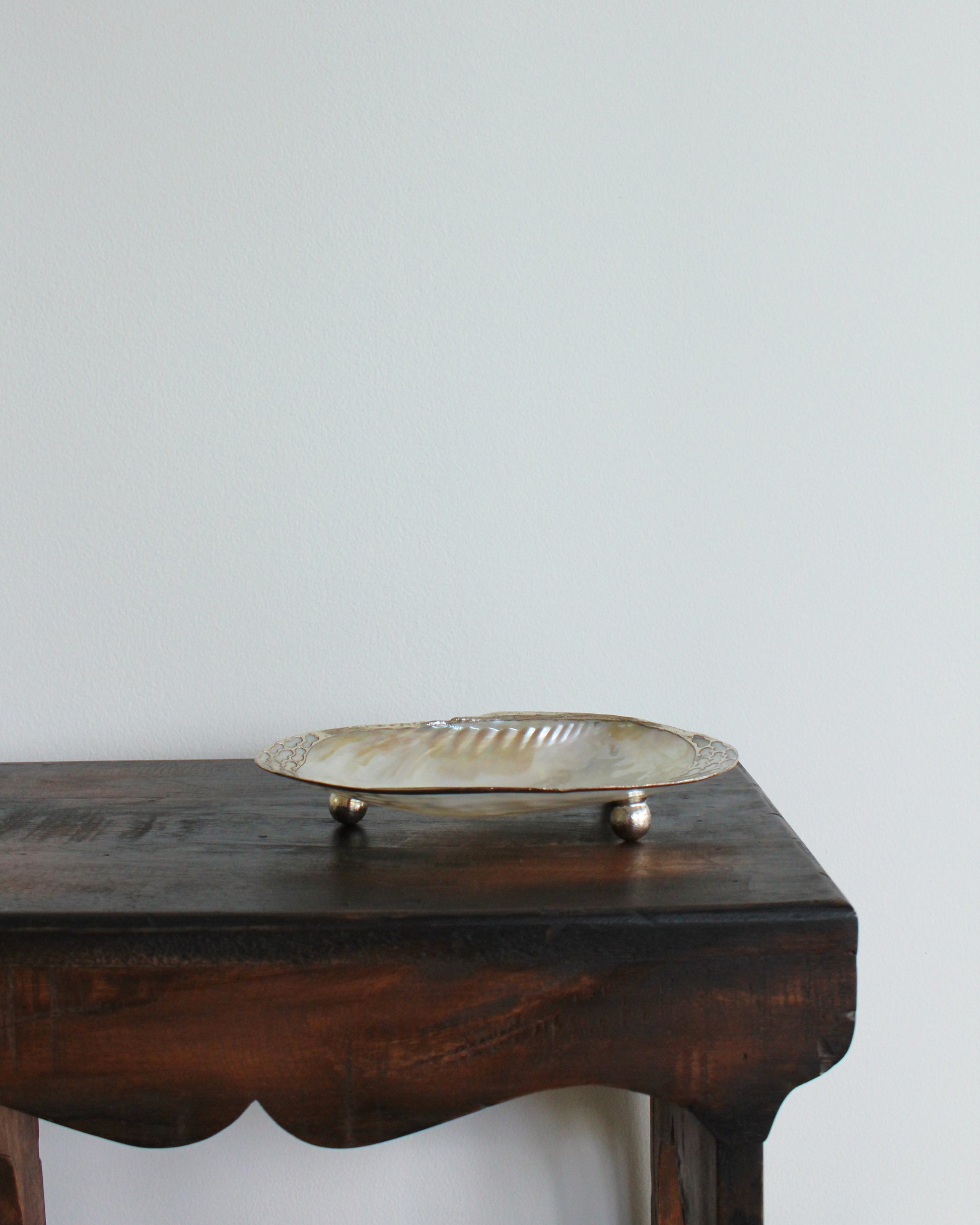 1970s silver tone filigree edge around an abalone shell dish. 3 silvered ball feet on base, no signs of chips, cracks or repairs. The underside has also been polished to a pearlescent shine.