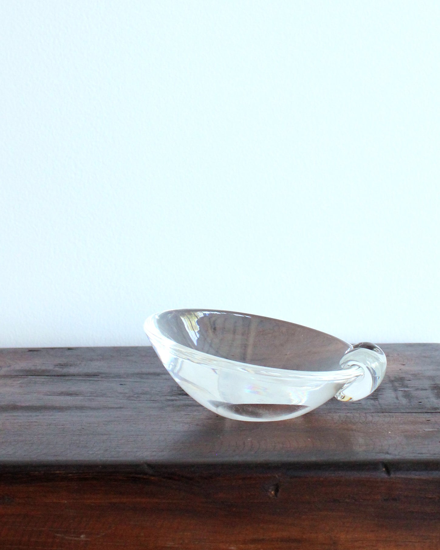 Designed by David Hills for Steuben in 1952. Crystal glass, with a sloped rim and small snail scroll design. Signed on base, scratches to base appropriate for age and use, no signs of chips, cracks or repairs.